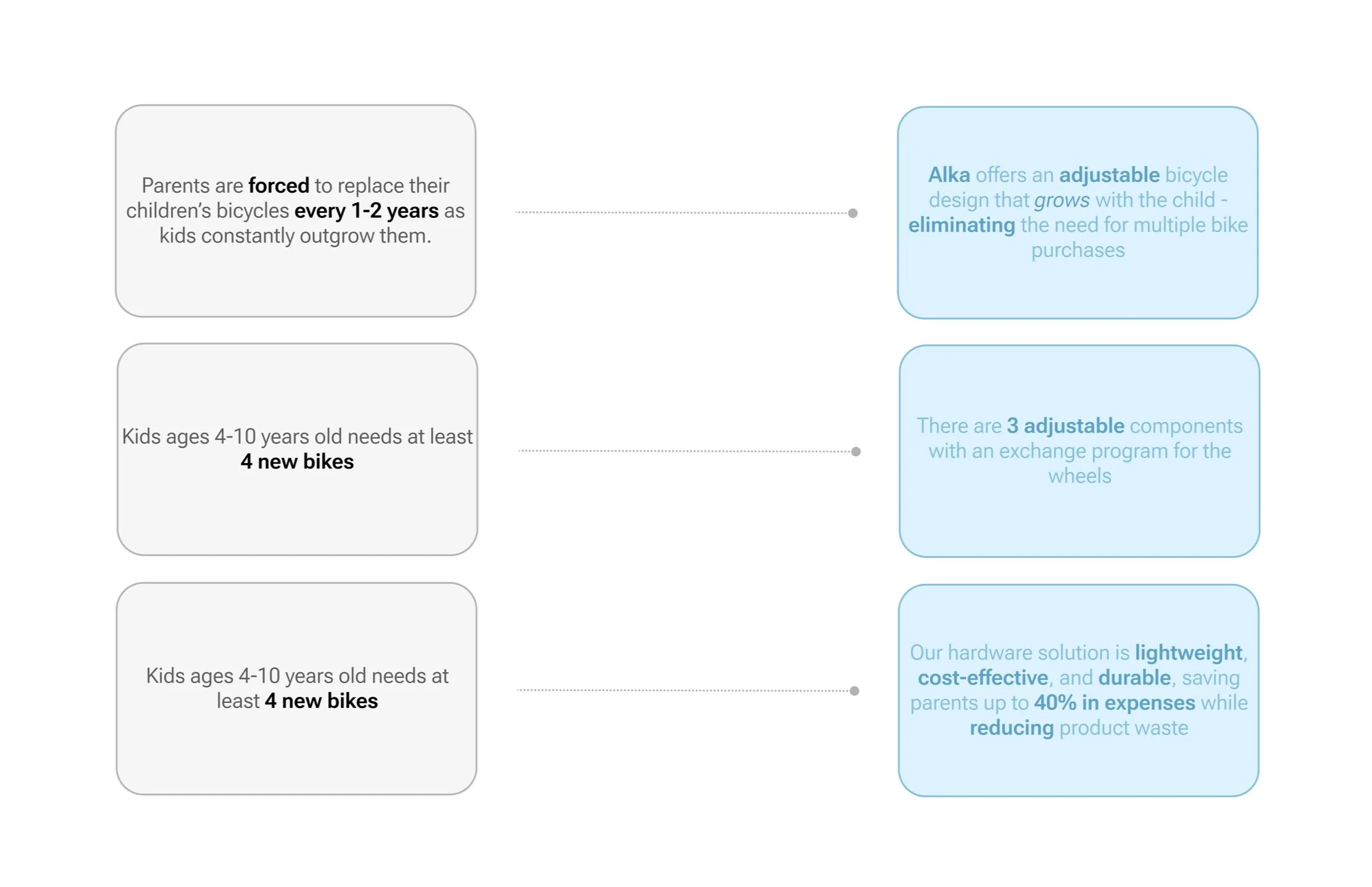 Our bike is thoughtfully engineered and designed with a frame that expands as the child grows over this 8-year development stage. Using a telescoping mechanism inspired by engineering principles used in tripods and adjustable gym equipment, the frame of the ALKA bike can be expanded to meet the child’s needs. To ensure safety, this technology is reinforced with precision locking joints to maintain structural integrity and rider safety at every size setting.